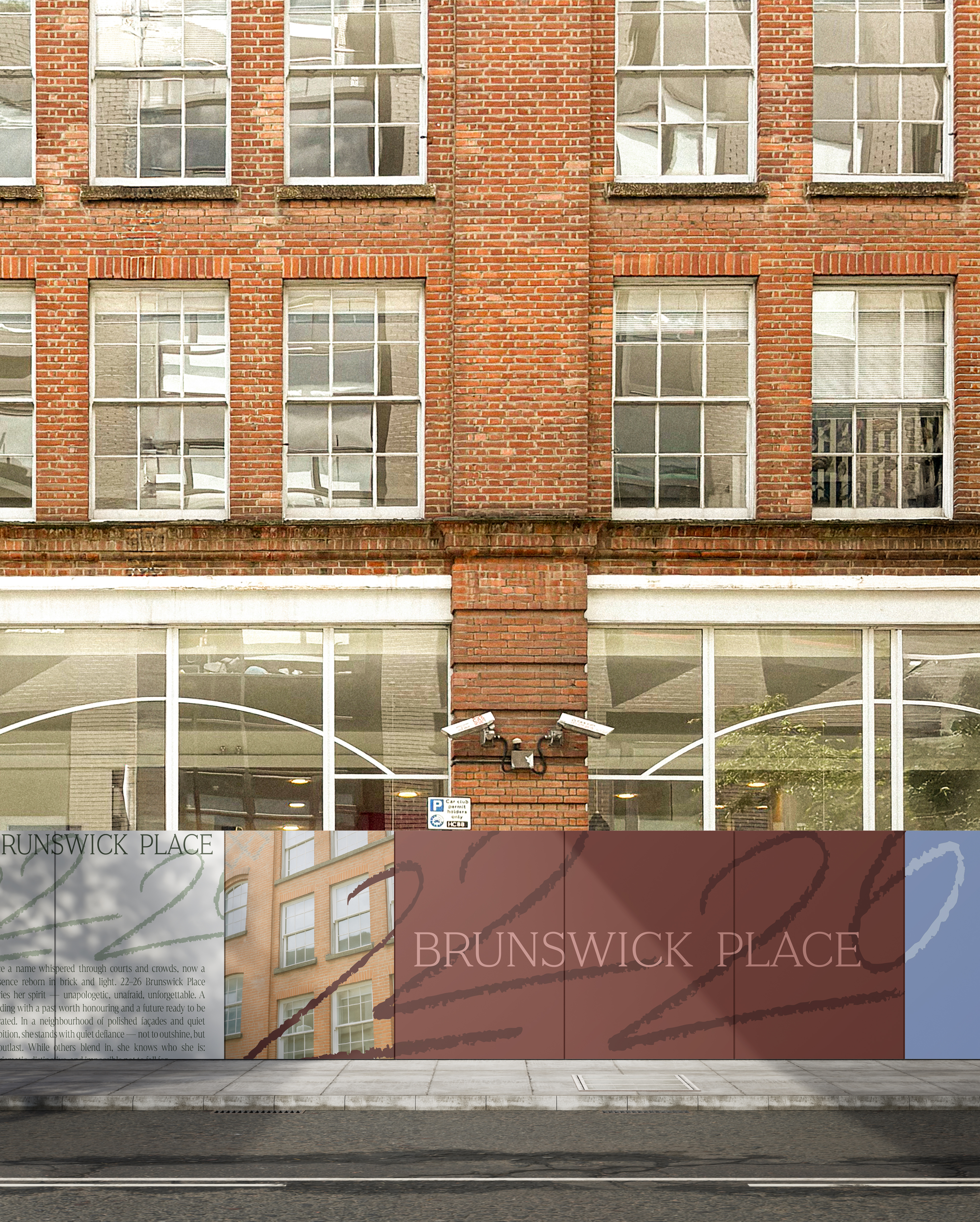 I developed the brand identity for the refurbishment of 22–26 Brunswick Place, a Grade II listed building in Shoreditch that had been underutilised and needed repositioning in the market. The aim was to create a narrative and visual language that would enhance tenant experience while celebrating the value of heritage and the character of East London’s warehouse architecture.